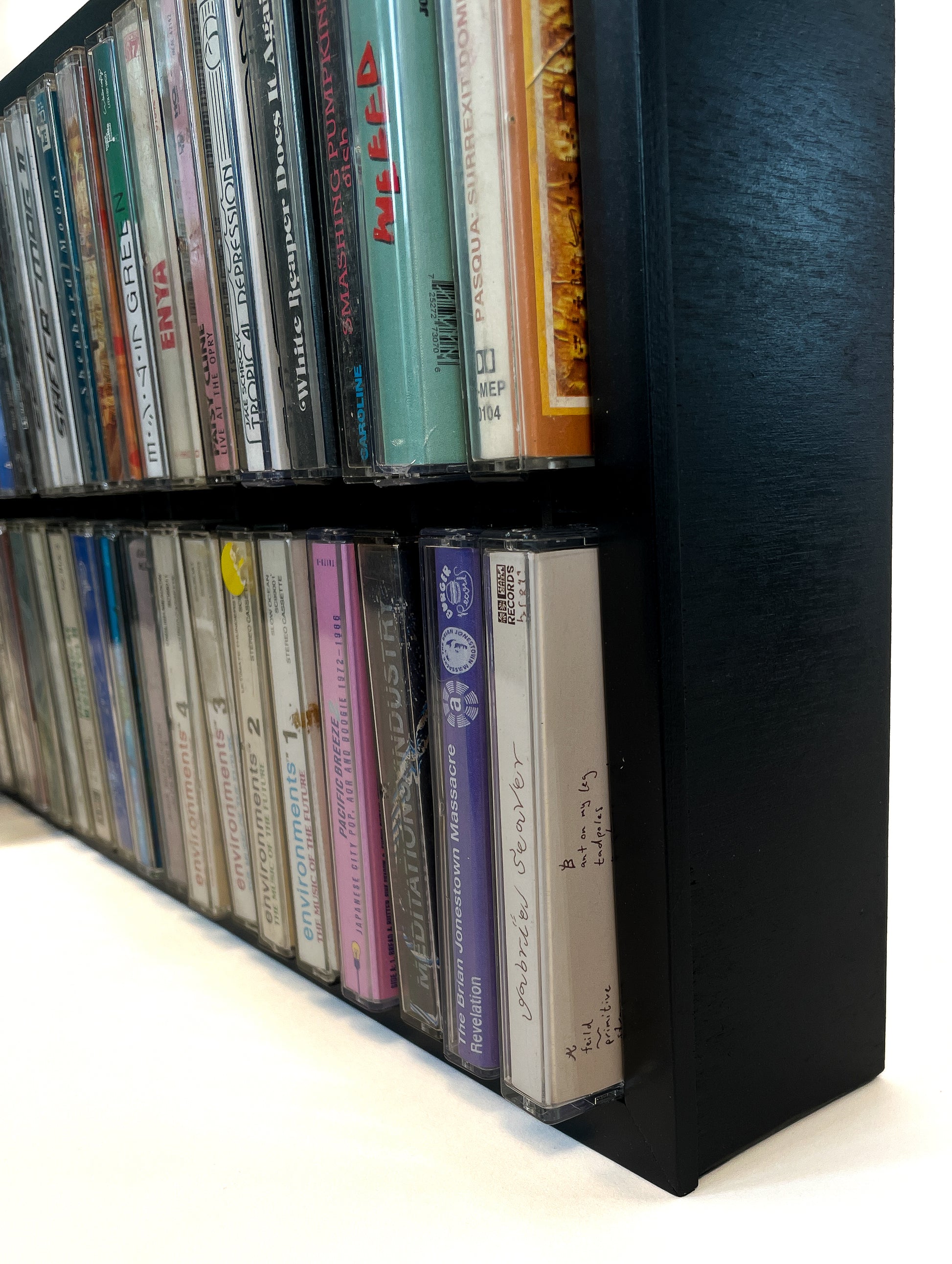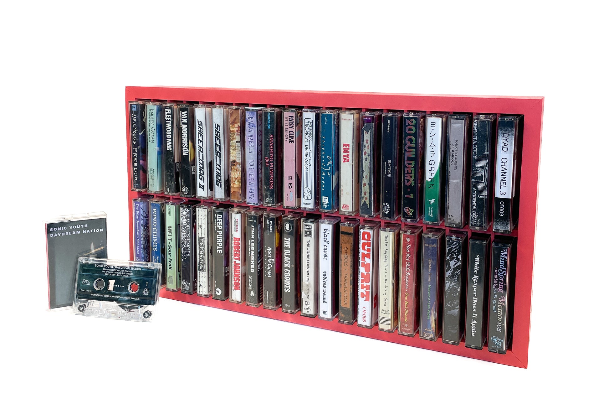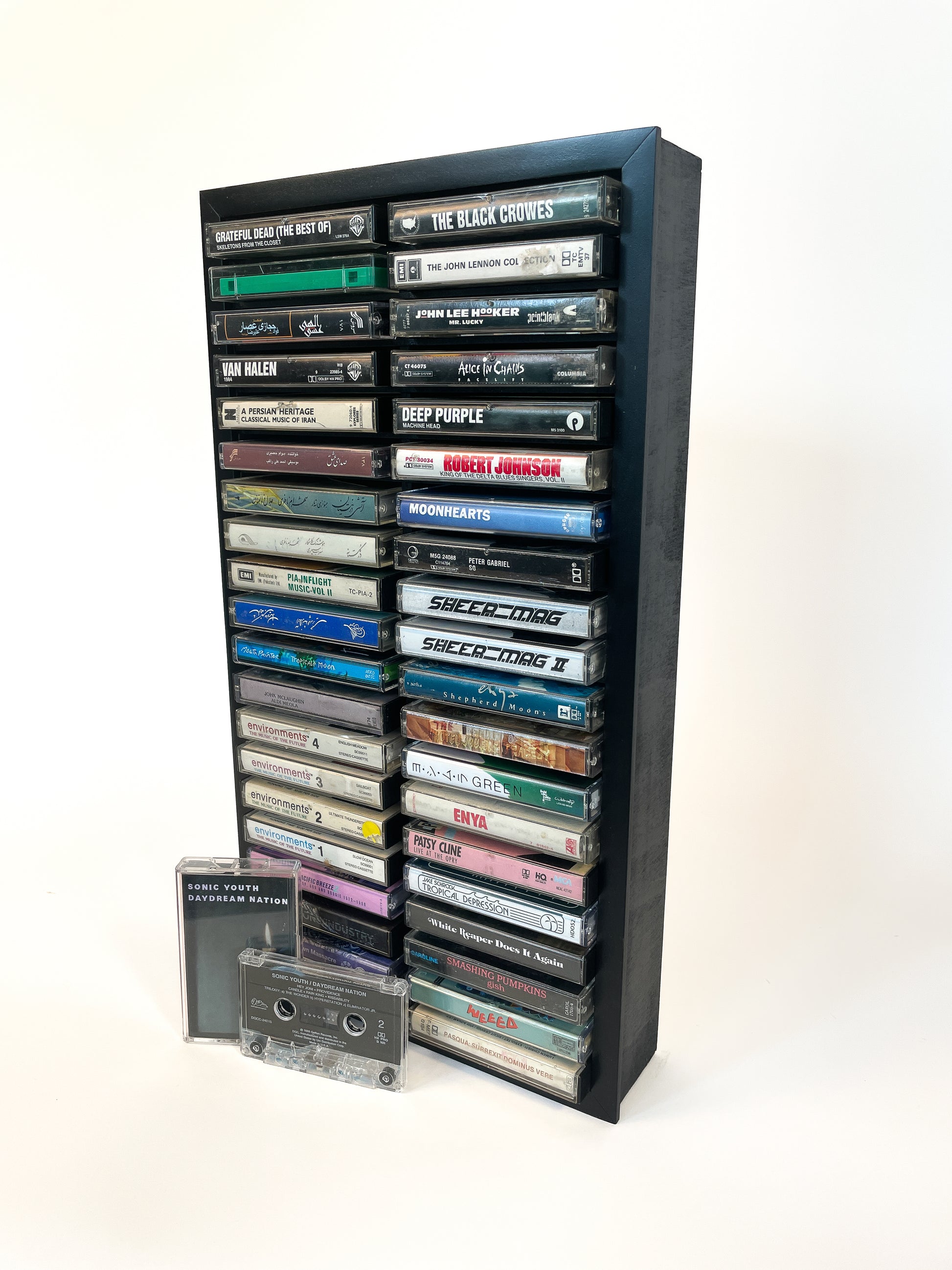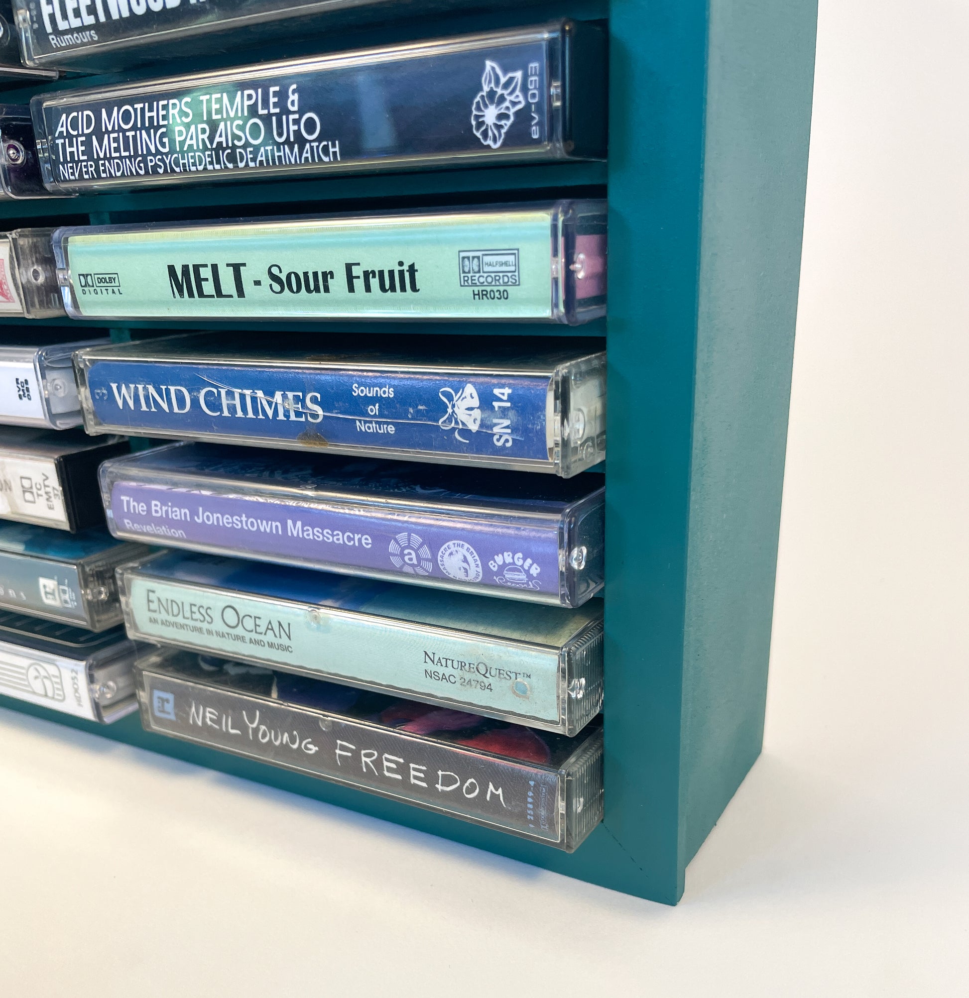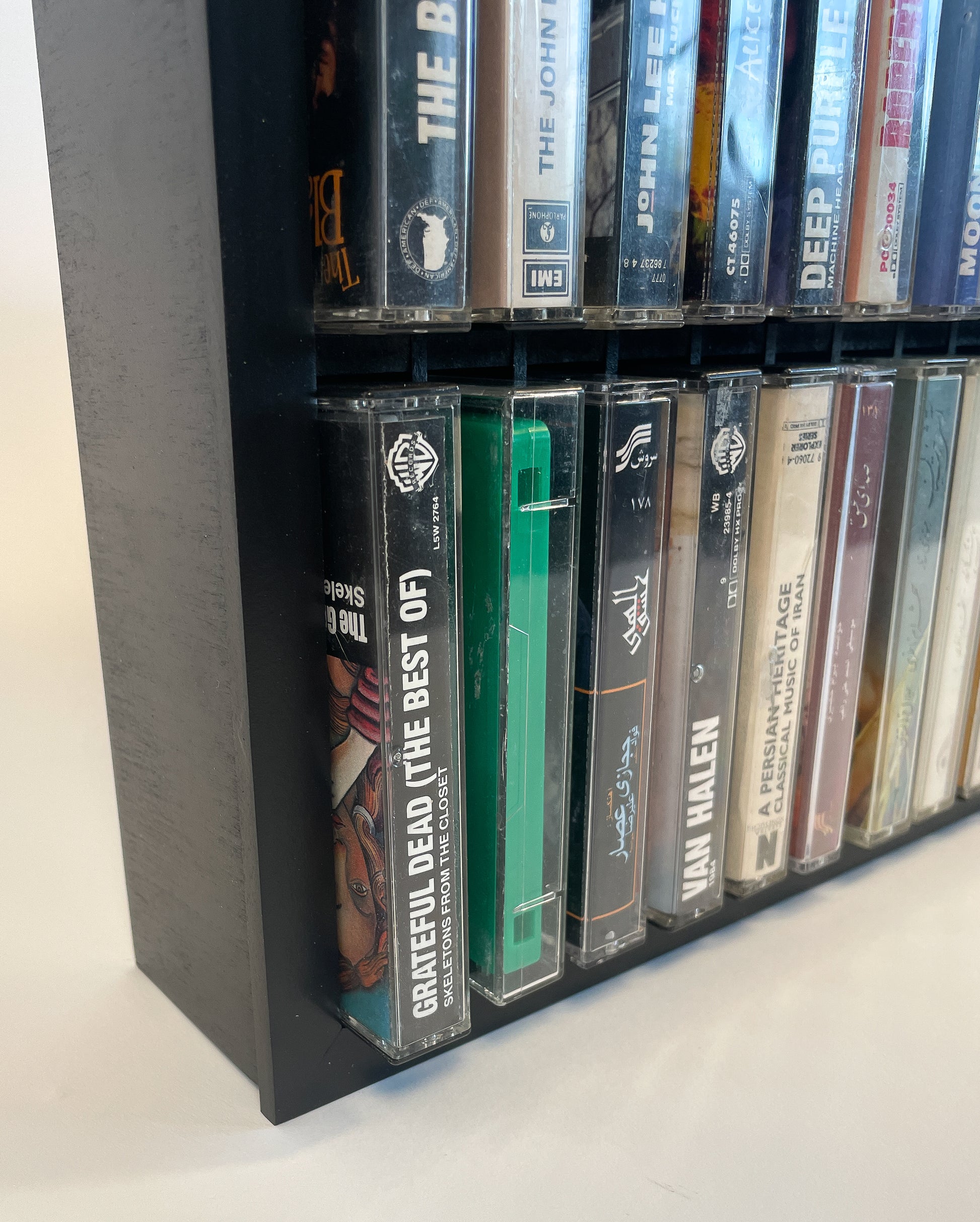 - Each slot fits a standard Cassette Tape (L)4 5/16” X (W)3/4” X (Depth)2 1/4”