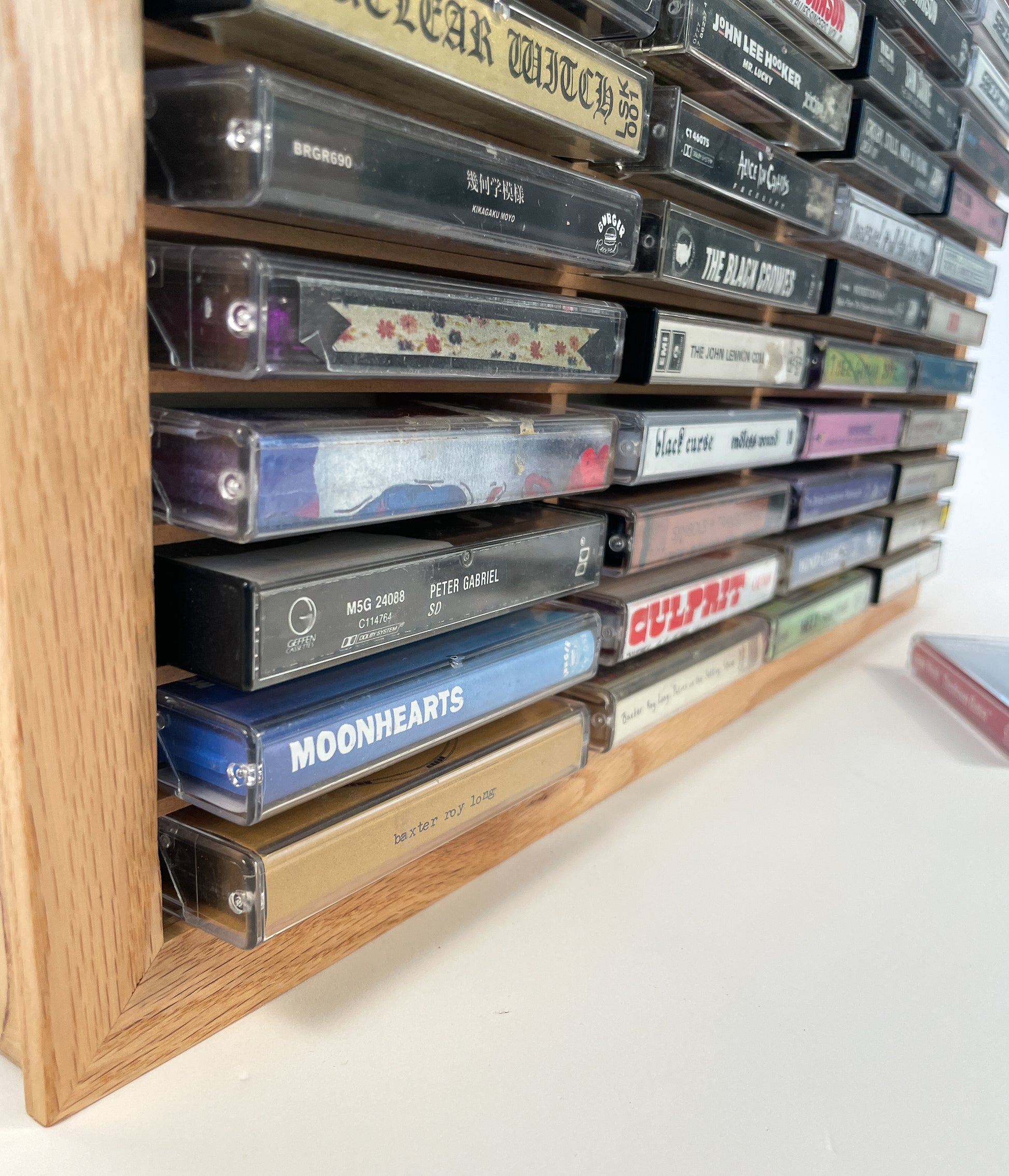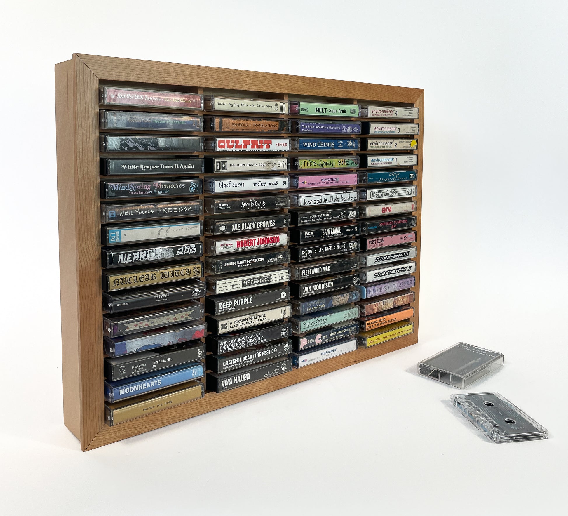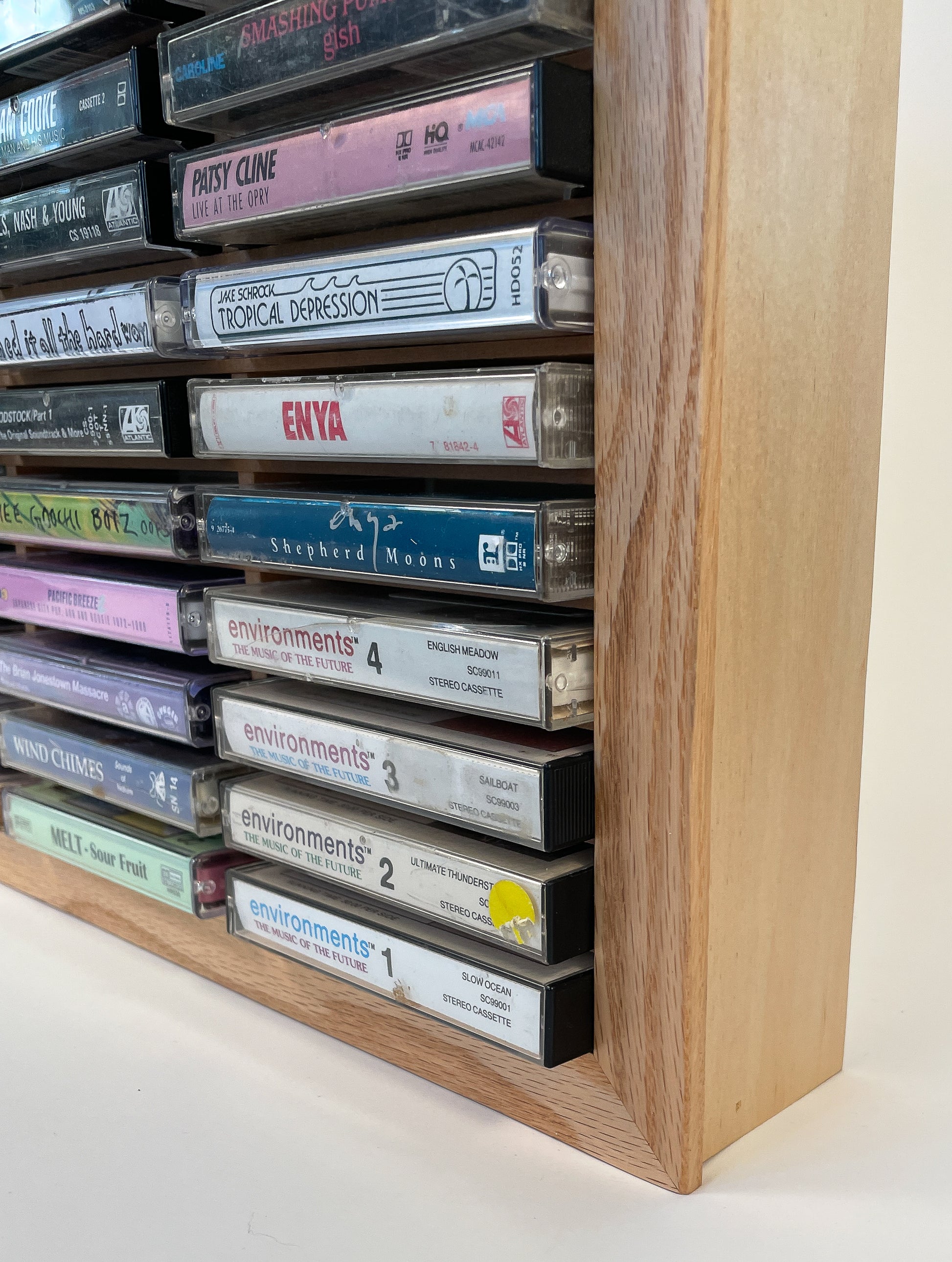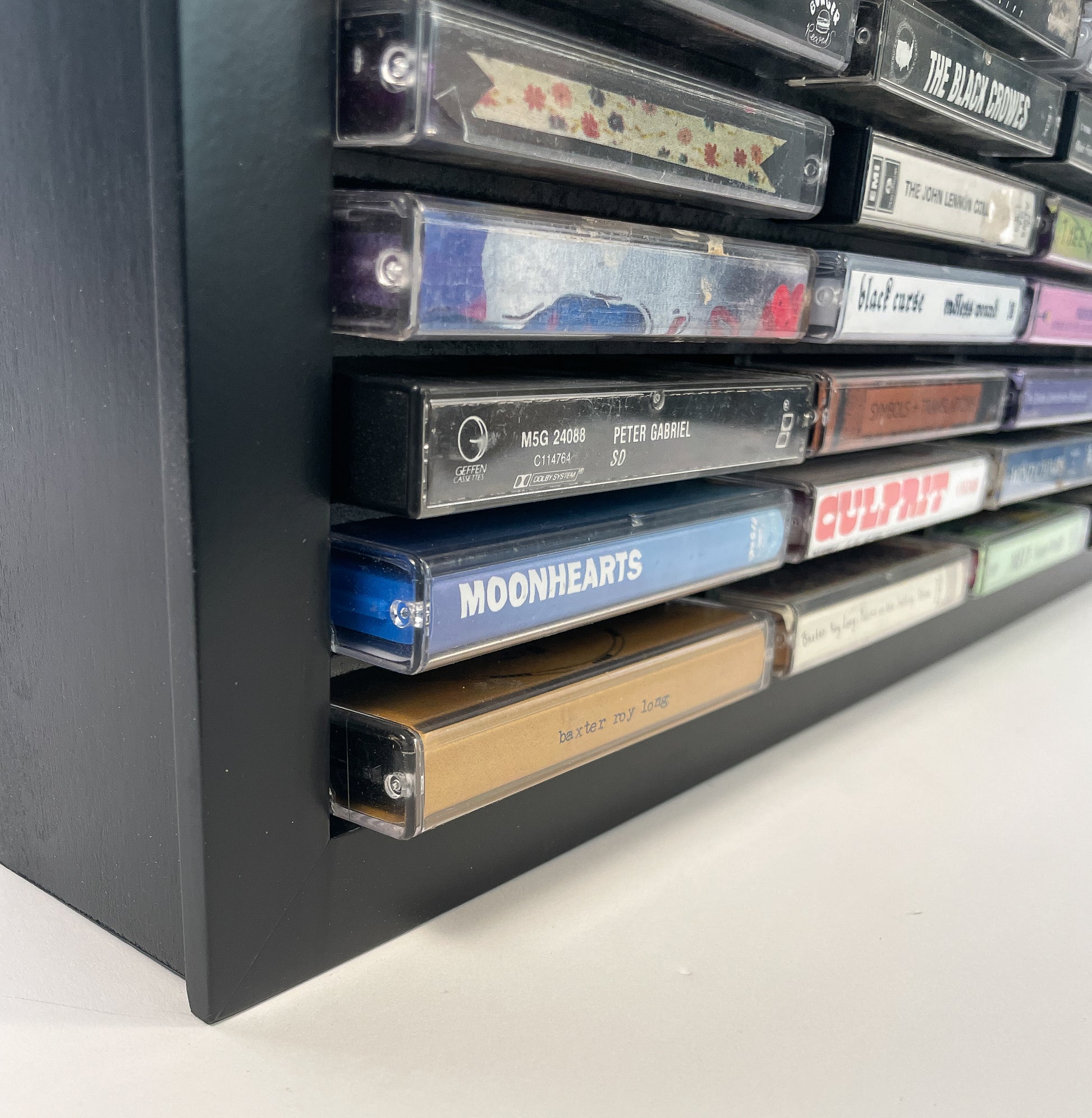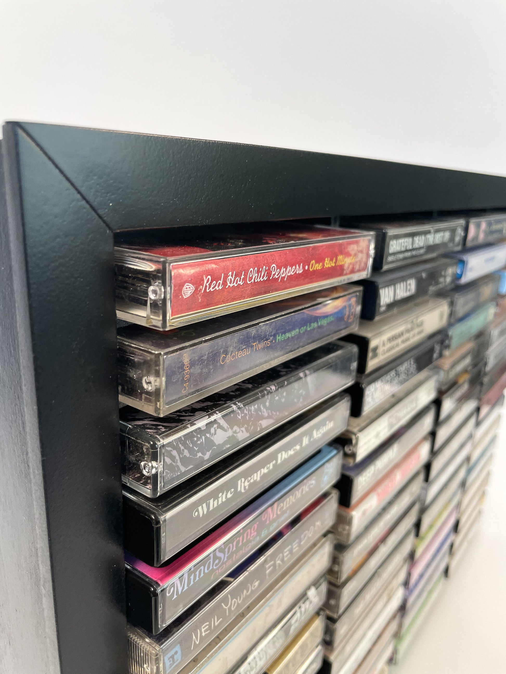 - Each slot fits a standard Cassette Tape (L)4 5/16” X (W)3/4” X (Depth)2 1/4”