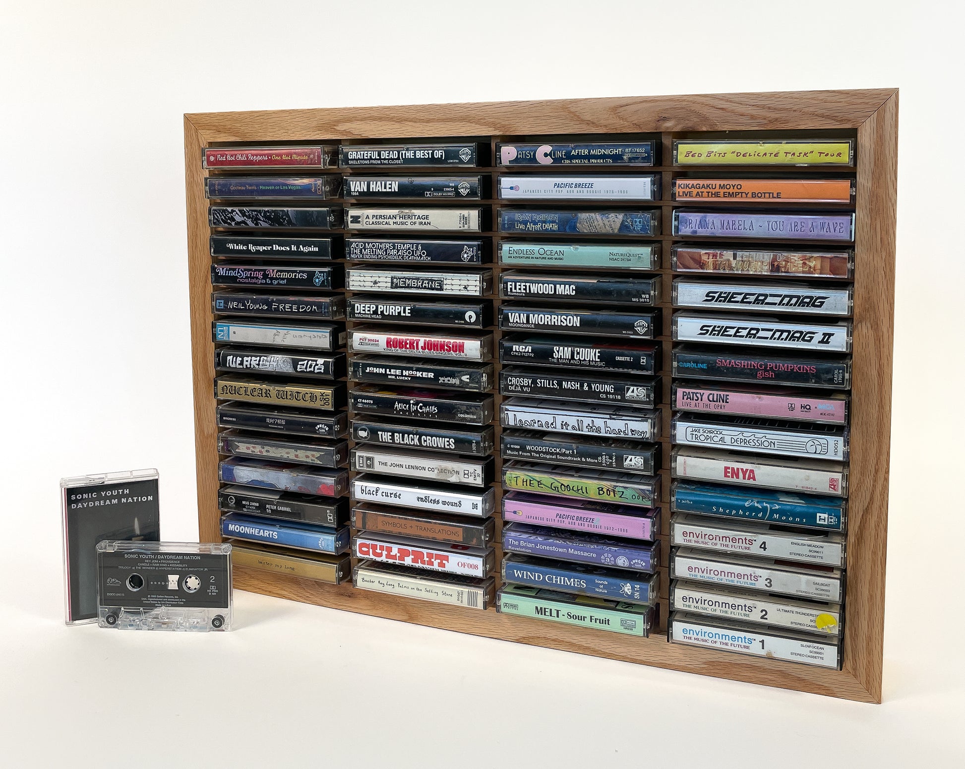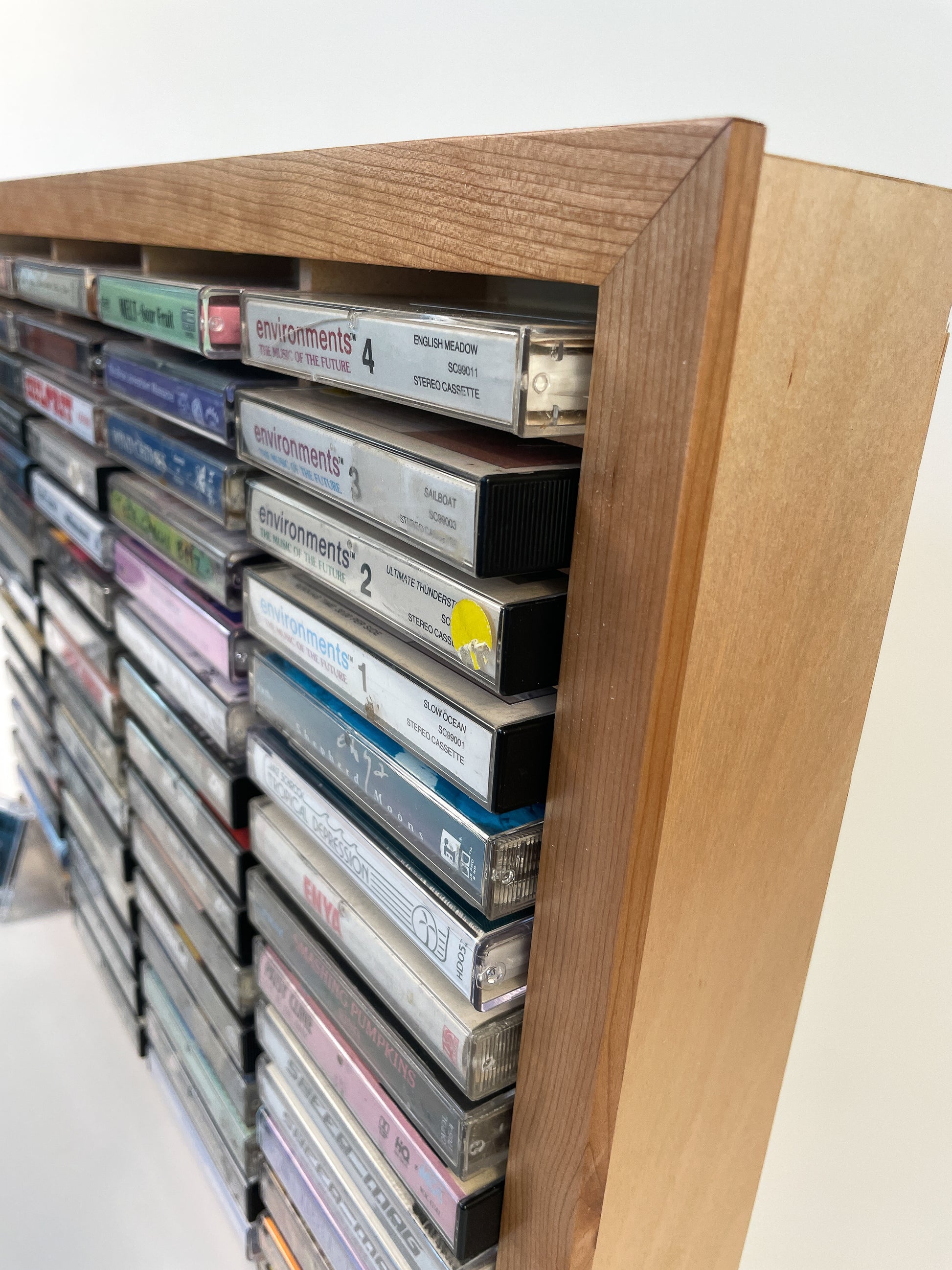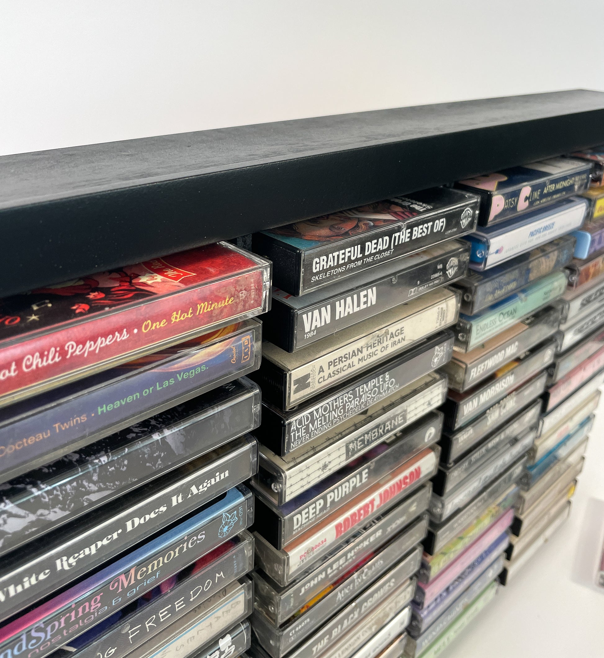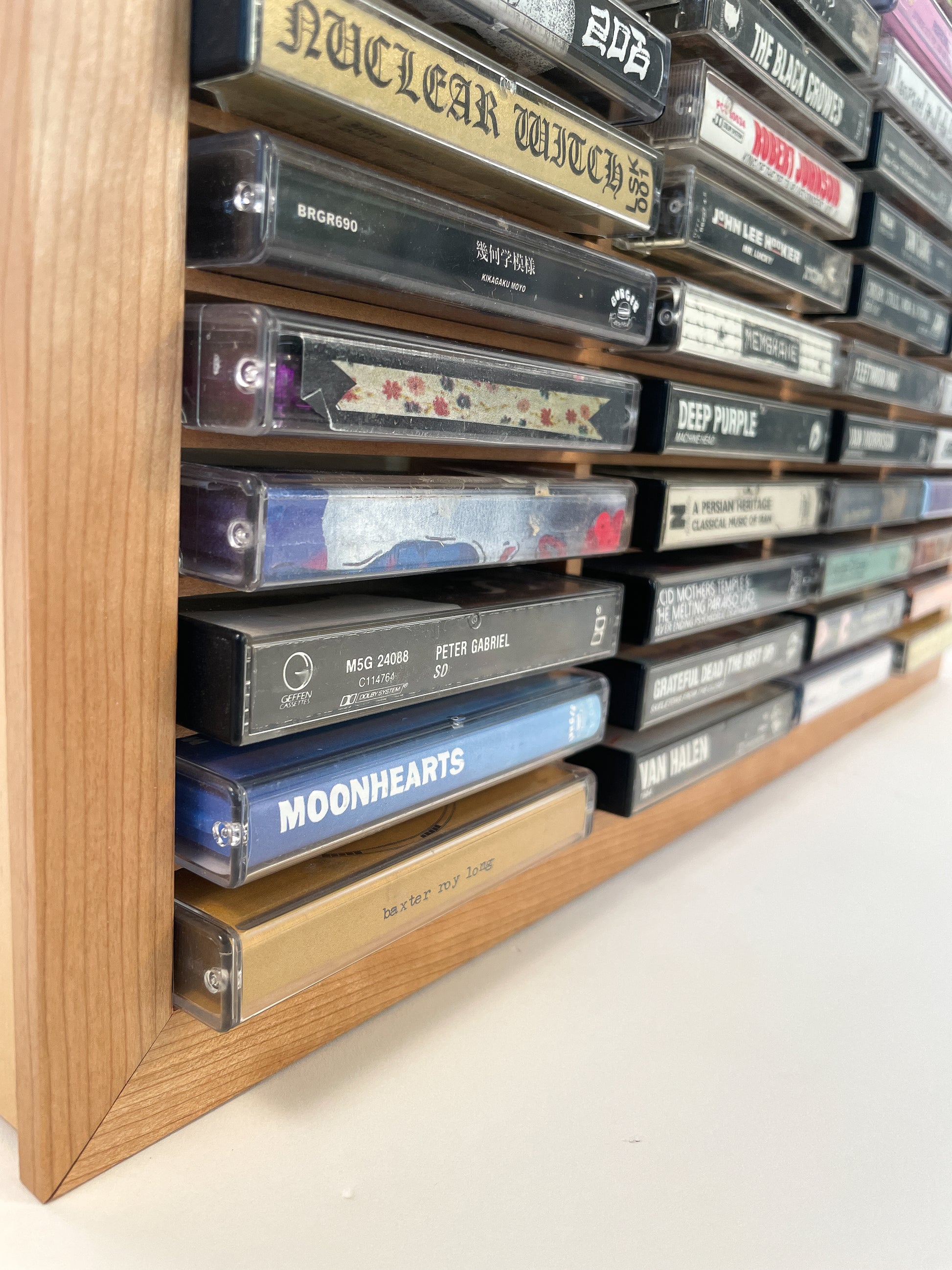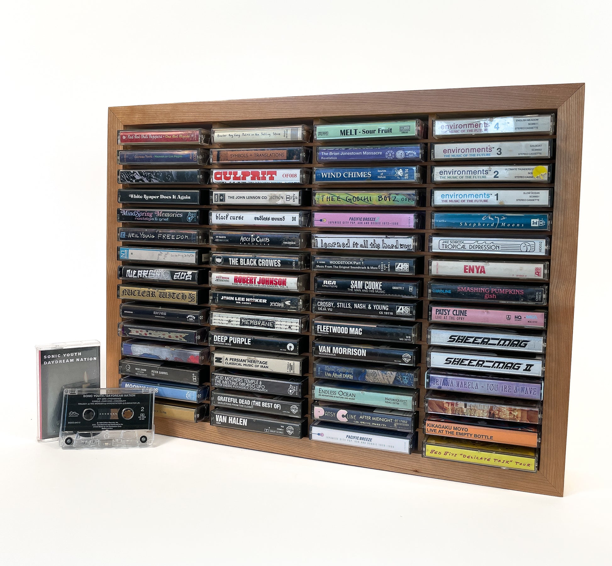 - Each slot fits a standard Cassette Tape (L)4 5/16” X (W)3/4” X (Depth)2 1/4”